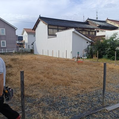 本日はH様邸の地縄張り、各所のレベル測定をおこないました。 1か月前は草ぼうぼうでしたが、草刈りと除草剤がよく効き、地面が見えるようになりました。 今回はコの字型の平屋住宅。距離と対角を取って、建物の角の位置を出していきます。各点を出した後、縄でぐるりと外周部分を覆います。これで建物が建...