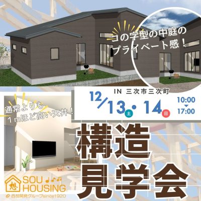 「中庭×高天井3.5m」開放感あふれる“コの字平屋”の秘密を体感!12/13・12/14は三次市三次町で見学会開催!