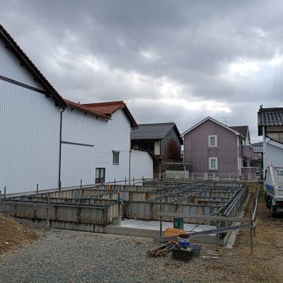 こちらの現場は基礎工事真っただ中です。現在はベースコンクリ打ちを完了し、立ち上がりコンクリート打ちの準備中です。 基礎幅に合わせて型枠を固定し、アンカーボルト等のセッティングをおこないました。 砕石後は4方に鎮め物を配置し、防湿シートを設置、この日は捨てコンを施工しました。 ...