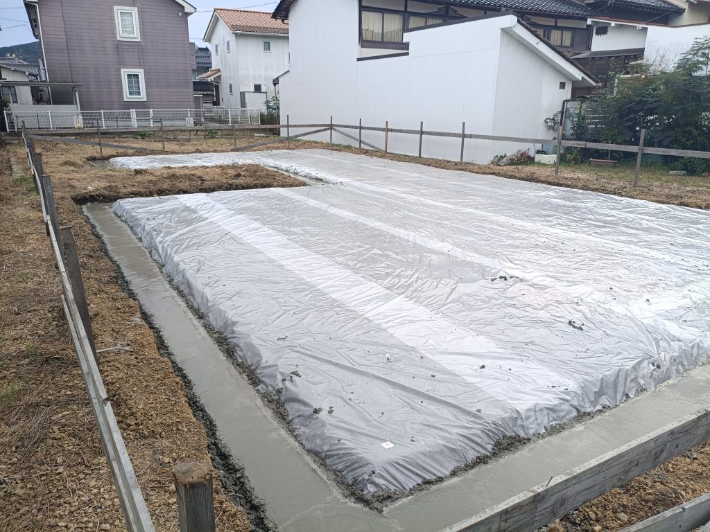 砕石後は4方に鎮め物を配置し、防湿シートを設置、この日は捨てコンを施工しました。