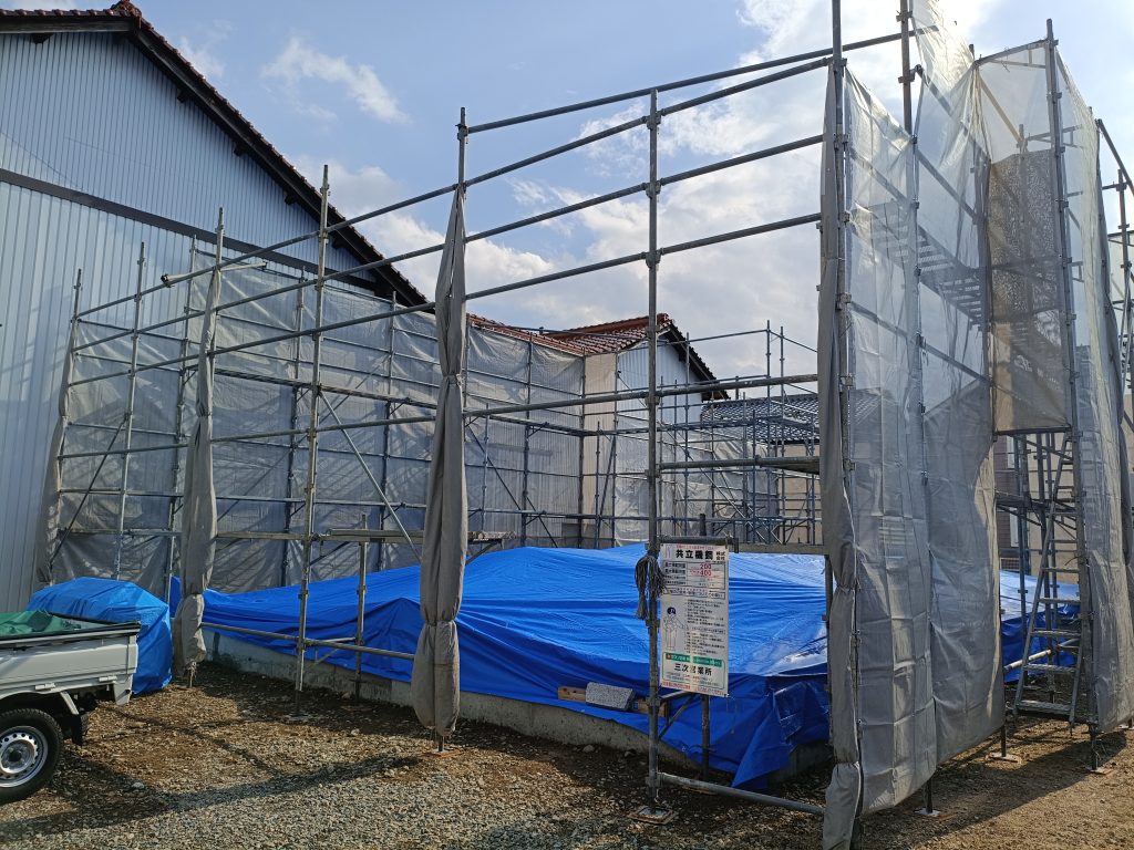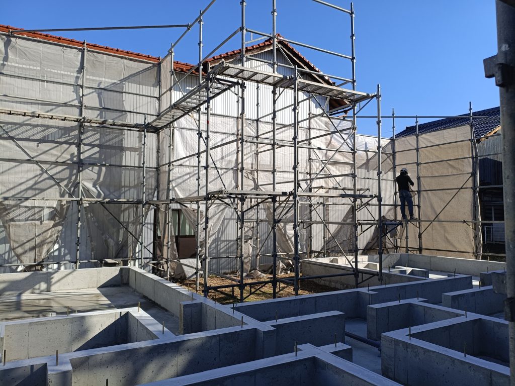 基礎工事が完了し、上棟前に土台敷き、足場を組んで準備完了