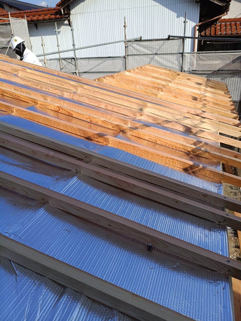 屋根なりに屋根断熱をとるため防水シートを施工。垂木を流しています。