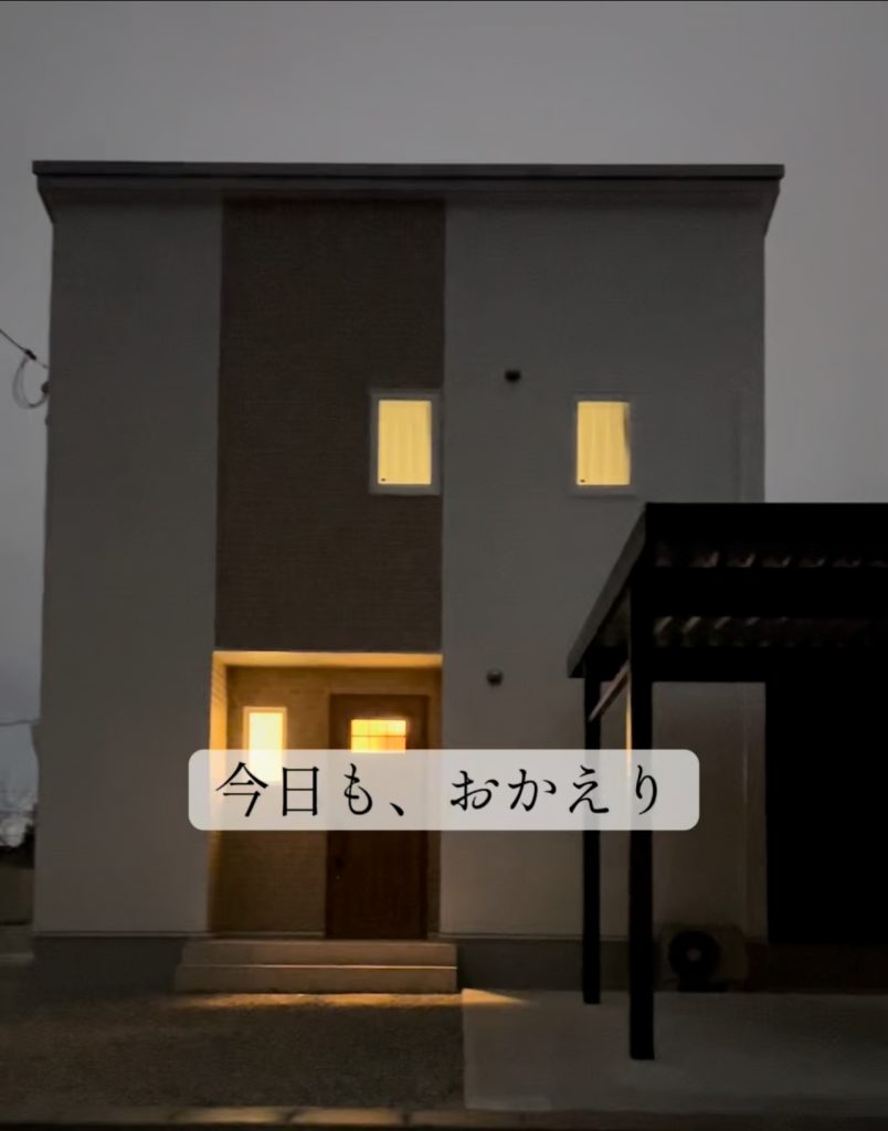 夕暮れ時、やさしい灯りがともる外観は、まるで「今日も、おかえり」と家族を迎えてくれるような佇まい。住まう人の暮らしにそっと寄り添う、あたたかな一邸が完成しました。