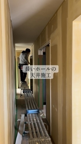 ▼三次町現場|長いホール天井のクロス施工の光景はこちら