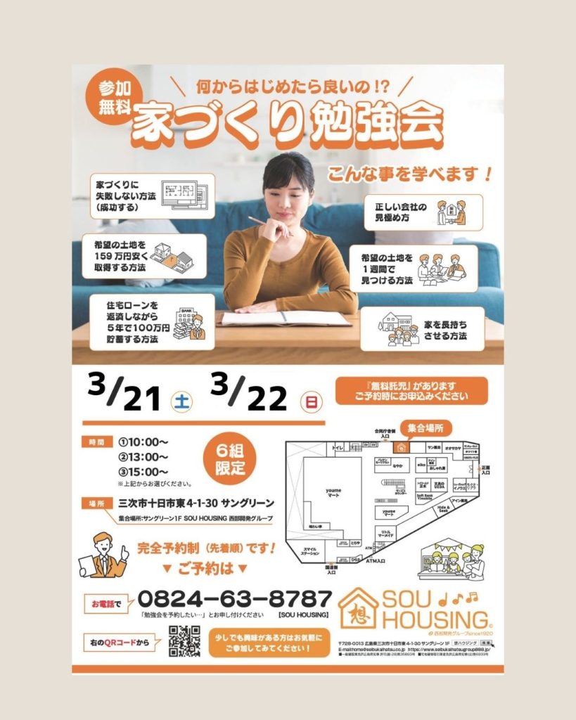 三次市・庄原市・安芸高田市・世羅町・邑南町で新築や平屋、注文住宅をご検討中の方にとって、これからの家づくりを一歩進めていただける時間になればうれしいです。玄関や土間収納をどう計画するか、間取りの考え方にご興味のある方も、ぜひお気軽にご参加ください。