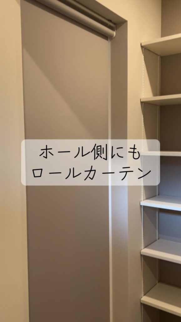 今回の土間収納は、玄関側・ホール側の両方にロールカーテンを設けているのもポイントです。来客時にはロールカーテンを下ろしてすっきりと見せることができ、普段は開けておいて、家族が自由に出入りしやすい“開放的な収納”として使えます。